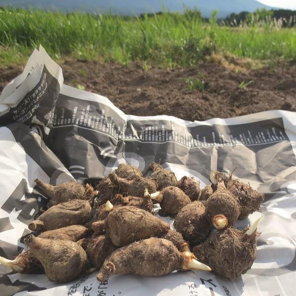 親芋も子芋も茎も食べられる青茎里いもの種芋です。地元ではズイキ芋やからどり芋ともよばれ、サトイモ科の中でも葉柄が穫れるので人気の品種です。地元では茎は茹でて和え物にしたり、天日で乾燥させて「からとり」の名前で親しまれており、干しずいきとなったものは汁の実に利用可能です。地元の郷土料理にかかせない保存食品となります。