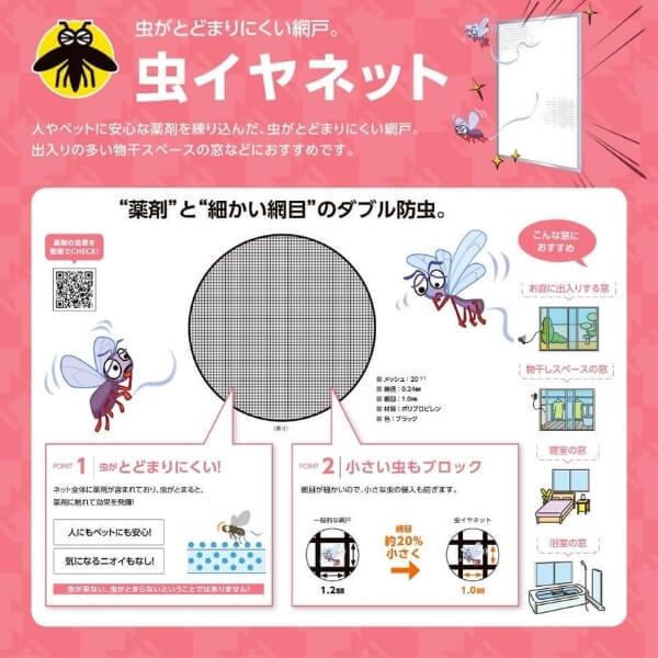 標準の網目の大きさは18x18メッシュ(網目の1マスの大きさは1.15平方mm)なので、体長1ミリ前後の小さい蚊の侵入虫は侵入できてしまいますが、最小30x30メッシュ(0.67平方mm)のものが開発されています。