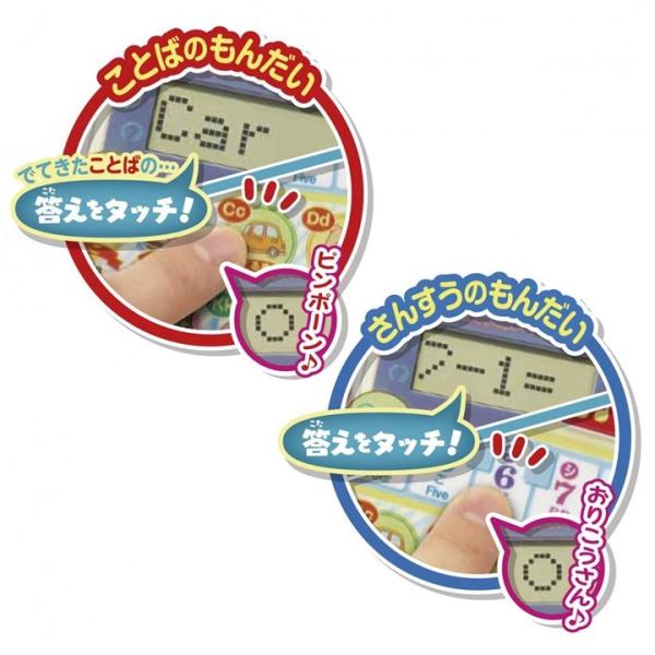 「もじ」「ことば」「つづりかた」「ことばのもんだい」「さんすうのもんだい」「ミュージック」モードを搭載。