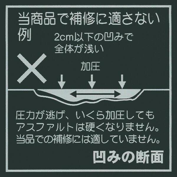 本品を袋から取り出し、そのまま2〜3cm位の厚さに盛り、加圧するだけで、熱を加えずアスファルト部分の穴埋め・補修ができます。