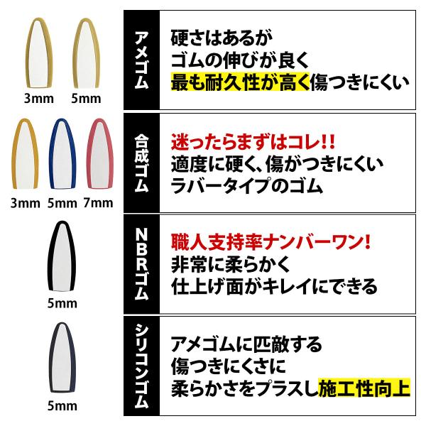 職人こだわりの形をベースとした加工済みの金ベラにテーパー加工の替えゴムを貼り付けて使うコーキングヘラ