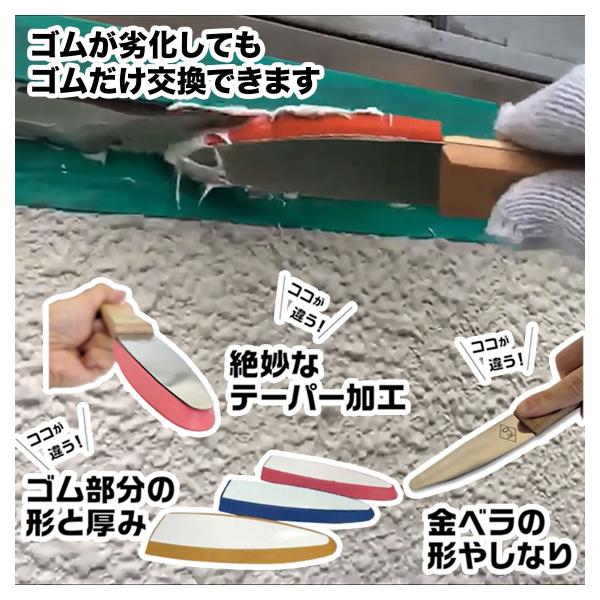 職人こだわりの形をベースとした加工済みの金ベラにテーパー加工の替えゴムを貼り付けて使うコーキングヘラ