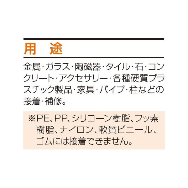 ※ポリエチレン、ポリプロピレン、シリコーン樹脂、フッ素樹脂、ナイロン、軟質ビニール、ゴムには接着できません。