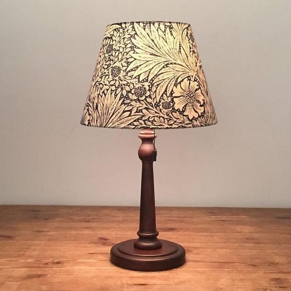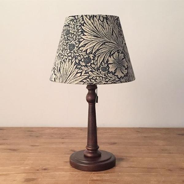 【コメント】日本でも人気の高いウイリアムモリスの生地を使用して作成したオリジナルのテーブルスタンドです。William Morrisの自然をモチーフにしたデザインは今なお世界中の多くの人々を魅了し続けています。こちらのMarigold(マリーゴールド)はマリーゴールドと柳の葉をモチーフに書かれたデザインです。深いネイビー色のこの生地は消灯時にも鮮やかな色彩が楽しめます。ランプシェード(布笠)の内側は耐熱樹脂を用いて上下巻込みにて仕上げております
