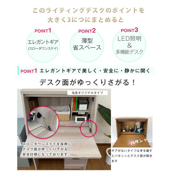 ●当店オリジナル。届いてすぐ使えるライト付きライティングデスク。省スペースデスクのロータイプ!それも、ハイエンドタイプにしか搭載しない、エレガントギア(スローダウンステー)をデスク面の開閉部に搭載!LEDライトはオプションでお選びいただけます。開梱設置料無料※一部地域追加送料あり