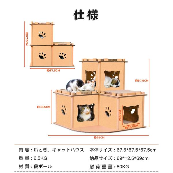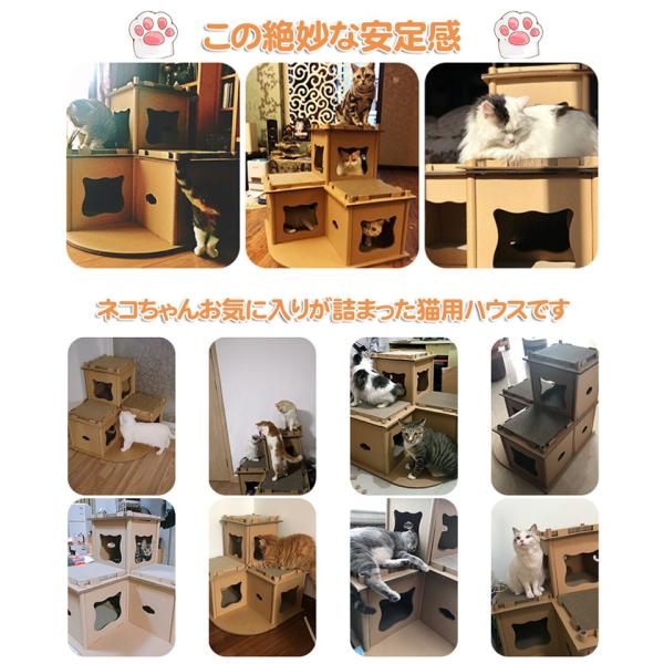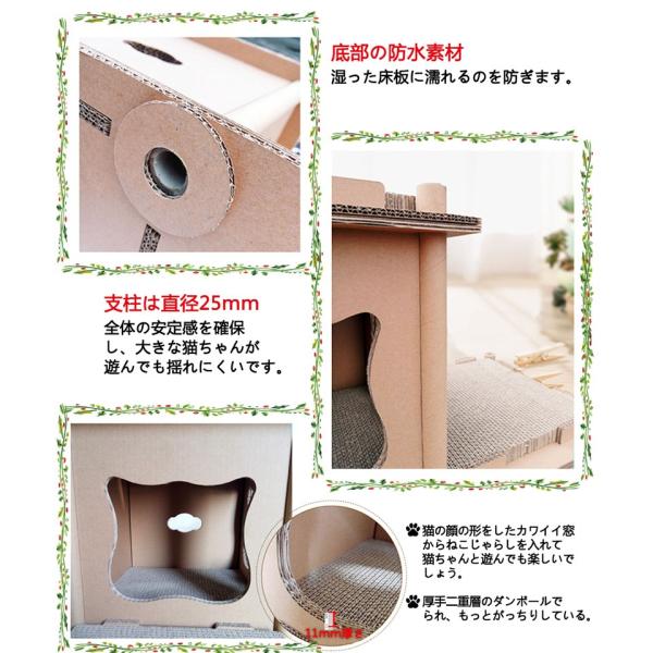 RAKU 猫ハウス キャットハウス つめとぎ キャットタワー ダンボール 三部屋型 多用途 組立式 ストレス解消 運動不足改善 耐磨耗性 多頭飼い