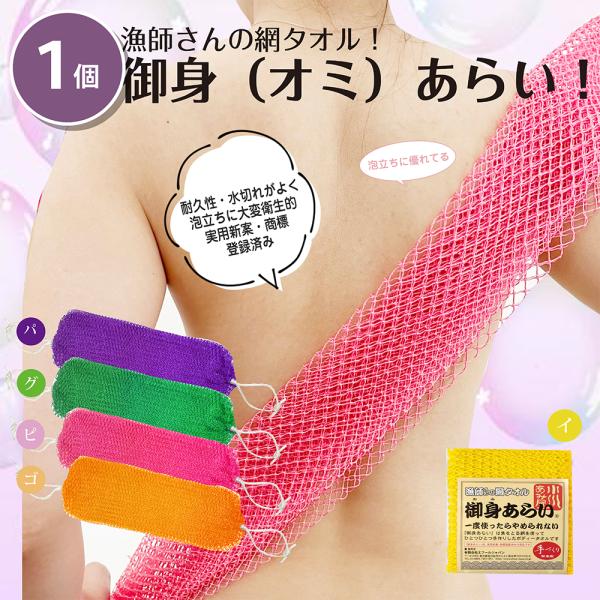 漁師さんの網タオル、「御身 (オミ)あらい」は魚をとる網を使って、一つひとつ手作業で丁寧に作られたボディタオルです。