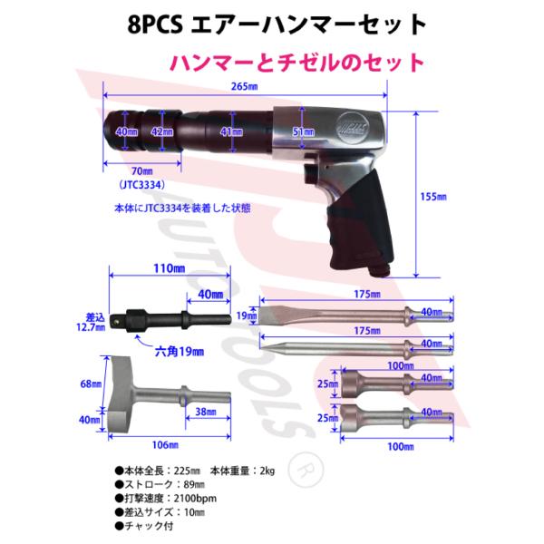 JTC3310K エアーハンマー8点セット エアーチゼル ハンマーセット 固着剥離 ボールジョイント タイロッドエンド エア工具 エアーツール