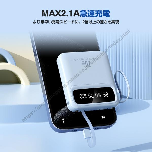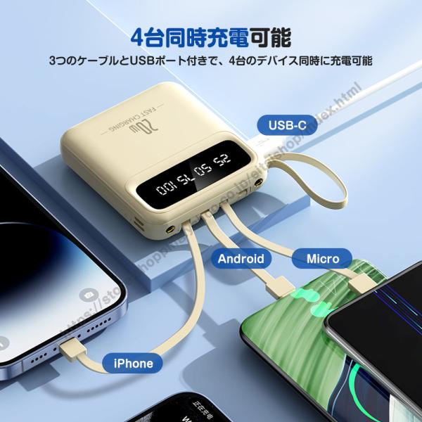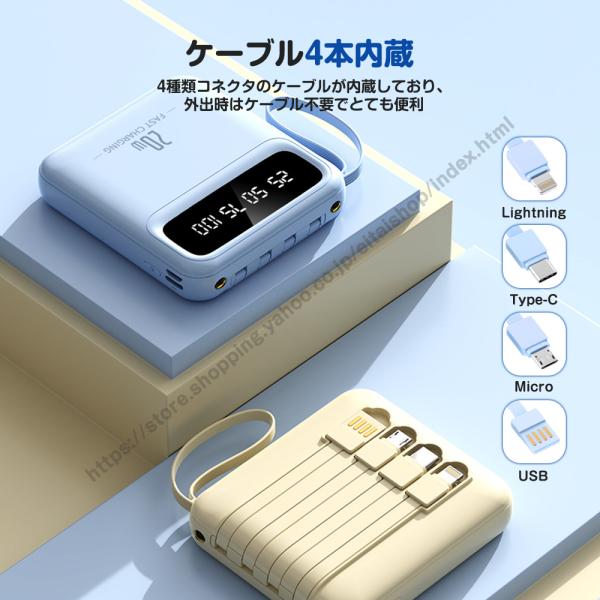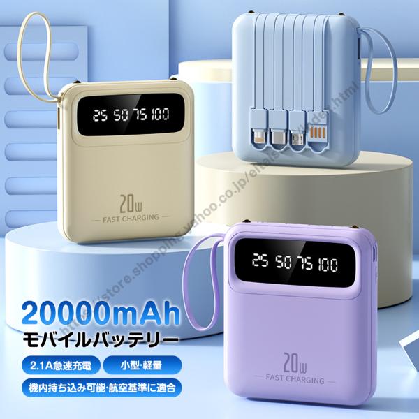 モバイルバッテリー 20000mAh 大容量 スマホ充電器 4台同時充電 急速充電 4本ケーブル内蔵 LED残量表示 LEDライト 軽量 小型 iPhone/Android対応 出張 旅行 防災