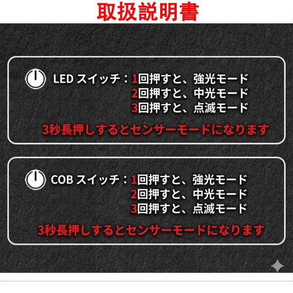 100%光量/50%光量/ストロボ点滅、のモード切替のほか、センサーモードもあり。