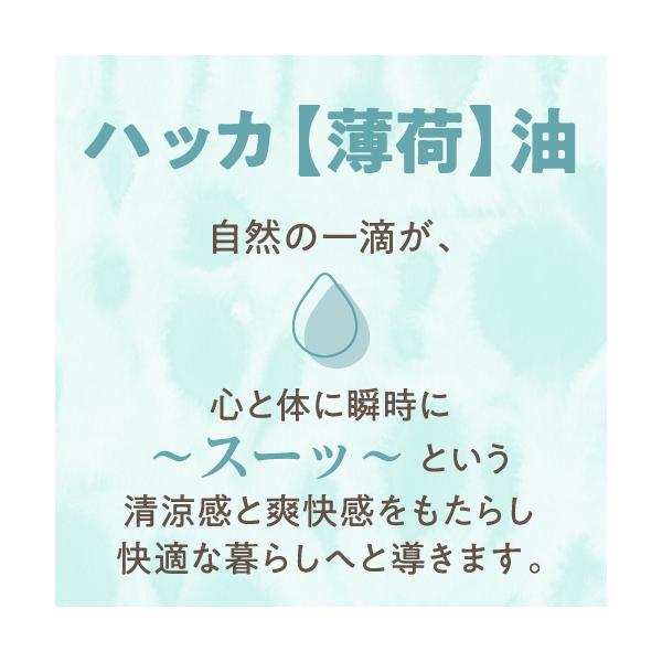 ハッカには大きく分けて和種ハッカ、ペパーミント(西洋ハッカ)、スペアミントがあります。和種ハッカには「l-メントール」という主成分が、ペパーミント(西洋ハッカ)よりも多く含有されており、スペアミントは主成分が「l-カルボン」で「l-メントール」は含まれていません。本商品は、シソ科ハッカ属の多年草「和種ハッカ(日本ハッカ/和ハッカ)」の葉を蒸留して精油を採り、さらに精油を精製して得た無色〜微黄色澄明の精油(エッセンシャルオイル)です。