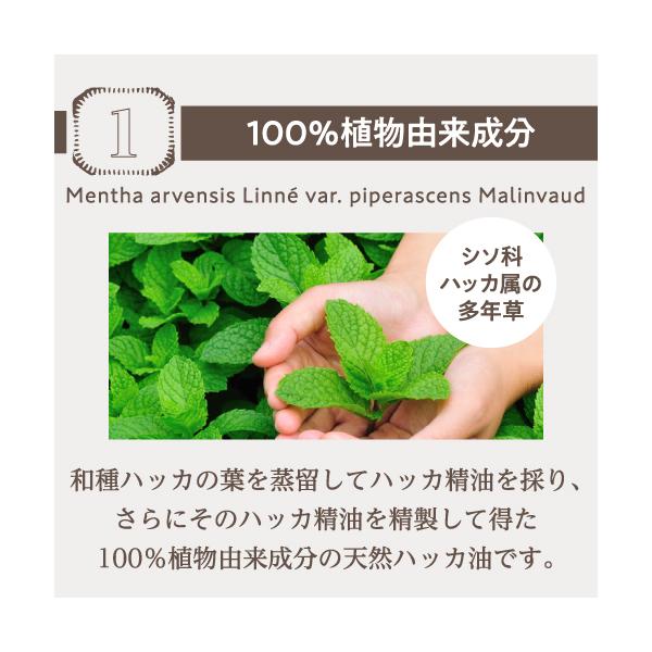 天然の和種ハッカを100%使用したハッカ油です。医師監修のもと、化粧品製造販売業・化粧品製造業の認可を受けている工場で生産された、安心・安全の日本製です。