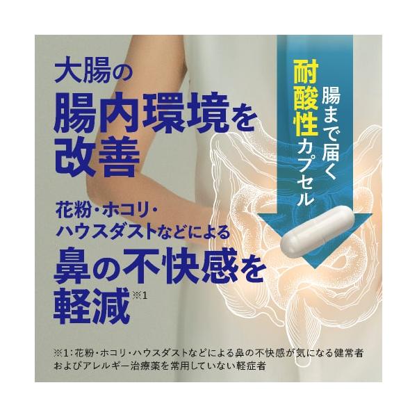 腸内環境を整えたい方、花粉・ホコリ・ハウスダストなどによる鼻の不快感(※1)でお悩みの方に。1日目安量1粒で、『ビフィズス菌BB536』100億個を簡単に補給できる医師監修の機能性表示食品です。ビフィズス菌BB536を生きたまま腸まで届ける『耐酸性カプセル』を採用しています。さらにサポート成分として、大腸まで到達し腸内でビフィズス菌のエサとなる、プレバイオティクスの『ラクチュロース:ミルクオリゴ糖(※2)』10mg(※3)をプラス配合。