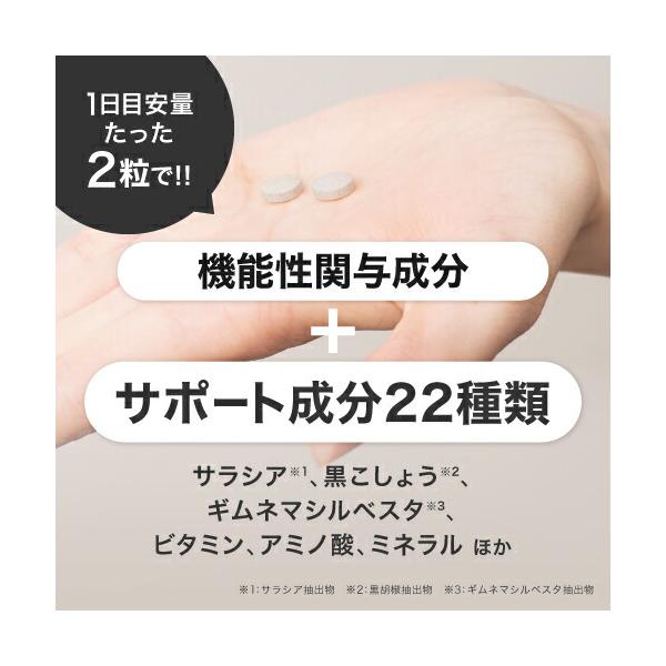 さらに、一日目安量たった2粒にサポ−ト成分22種類を独自にプラス配合。サラシア抽出物や黒胡椒抽出物、ギムネマシルベスタ抽出物、ビタミン7種類、必須アミノ酸2種類、ミネラル3種類など健康維持に欠かせない多様な成分が頑張るあなたを力強くサポ−トします。