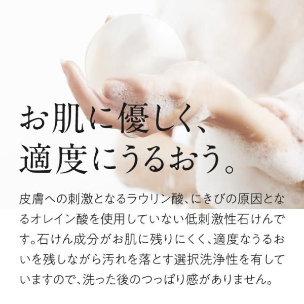 皮膚への刺激となるラウリン酸、にきびの原因となるオレイン酸を使用していない低刺激性石けんです。素肌にやさしく、お肌に適度なうるおいを残します。