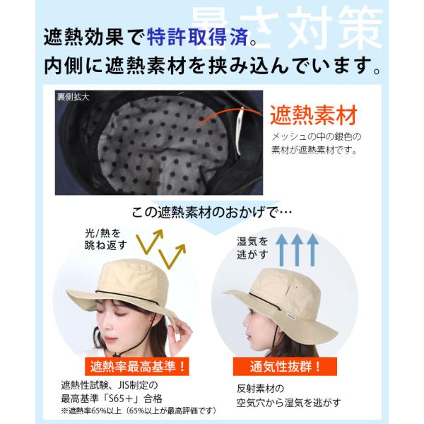 遮熱効果で特許取得済!光も熱もはね返す遮熱素材を挟み込み、体感温度-10℃を実現する帽子。