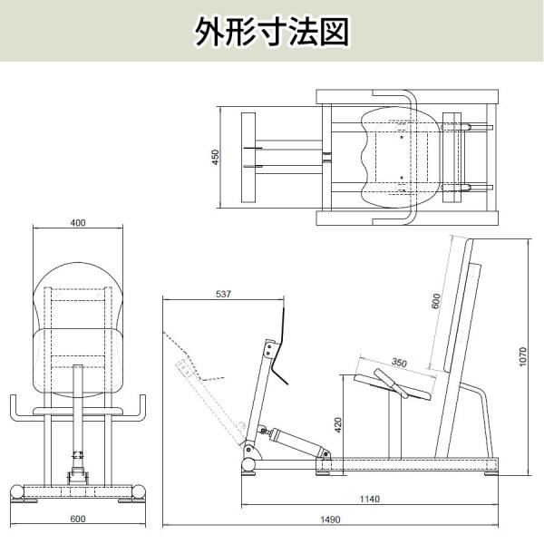 省スペースで簡易的な片側抵抗トレーニングができる両足の訓練台。負荷を簡単に調節できる25段階調節機能付き油圧シリンダーを採用。床面との隙間を微調整できる直径6cmのオリジナルアジャスター付き。