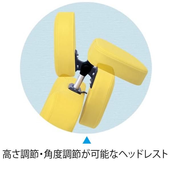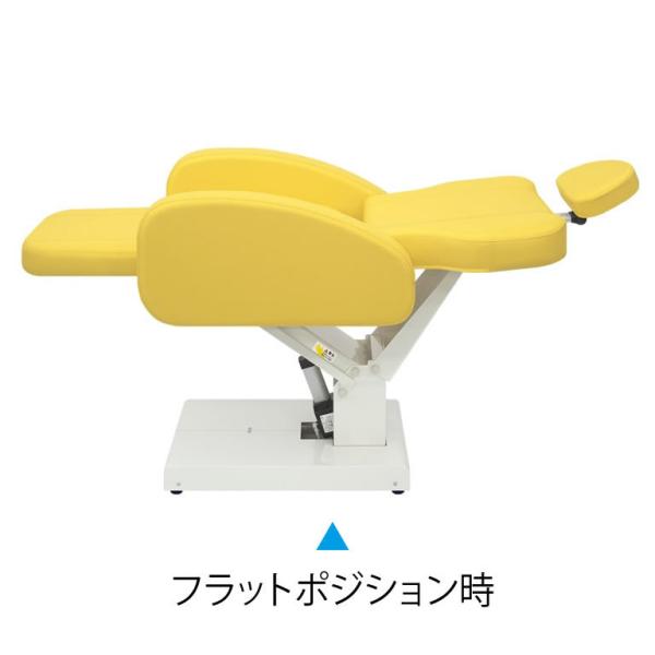 椅子型から診察しやすい高さまで昇降するフラットポジションを実現。背と脚が連動する同時角度調節機能付き。背0〜70°。脚0〜−90°。簡単な手動操作で高さ調節と角度調節が可能なヘッドレストを採用。※医療機器届出番号:27B3X00231000037