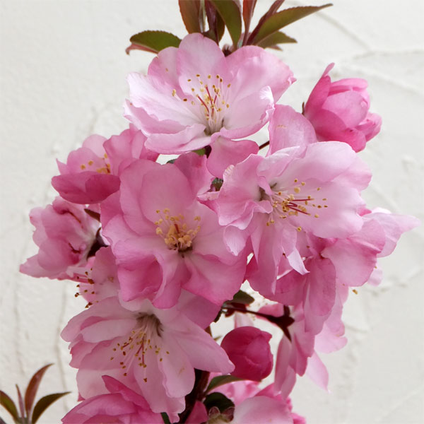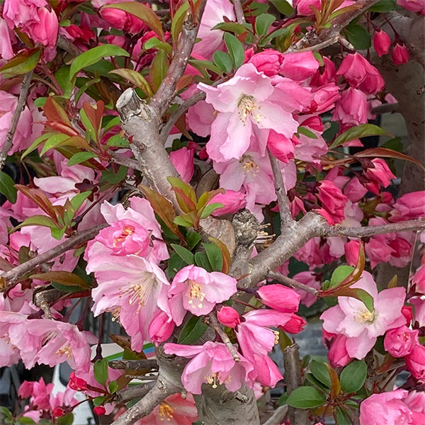 花カイドウはバラ科の落葉広葉樹で、ハナリンゴ(マルス)の1種です。ズミとも呼ばれます。春の花を代表する、見事なピンクの花を咲かせます。開花期は4〜5月頃で、咲き始めは紅色、開くとピンクとなります。花柄は長く垂れ下がります。花後に直径2cmほどの小さなマメ状の黄色の果実がつきます。建物のまわりに植えたり、庭園樹としておすすめです。