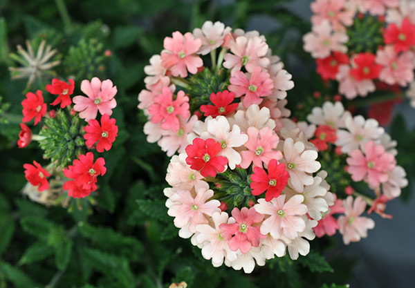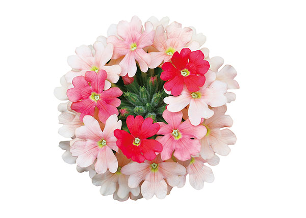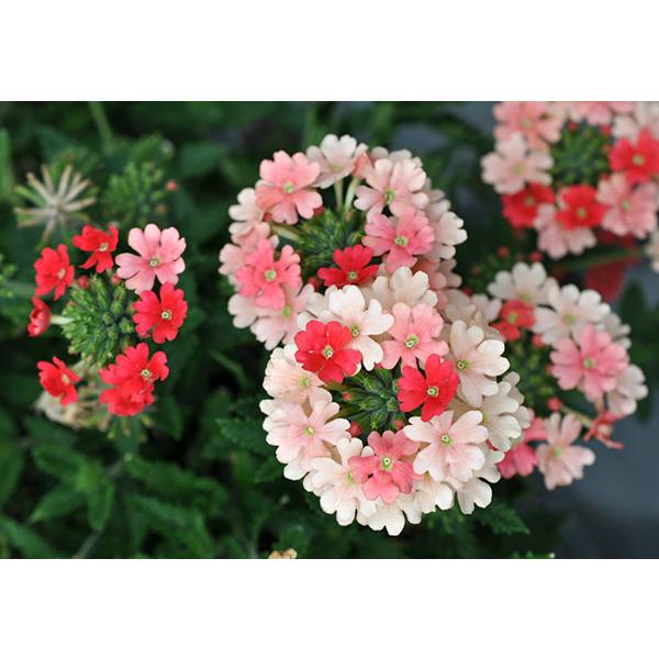 スーパーベナは花房が大きく、色鮮やかで雨や病気に強いバーベナ。これまで品種改良に利用されてこなかった耐病性のあるバーベナの原種を利用して新たに開発された強健な品種です。ややこんもりした半立ち性で、生育旺盛、栽培はとても簡単です。暑さに強く、秋まで咲き続け、分枝・花上がりともに早く、まとまりのある形に仕上がります。大きな花と濃い緑の葉が迫力ある印象の品種です。