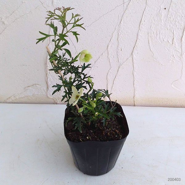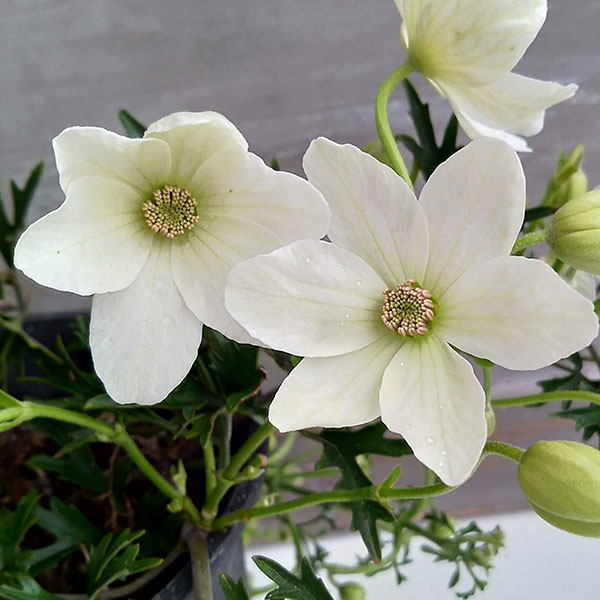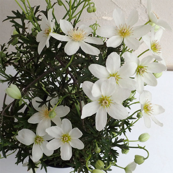 カルトマニージョーはオーストラリア原産のクレマチスから生まれた園芸品種。常緑性です。春先に緑がかったクリームイエローの花をたくさん咲かせます。つるが伸びない木立ち性で乾燥にも強く、鉢花として楽しむことができます。花後はプランターなどに植え替えておけば翌年以降もたくさんの花を咲かせ、また観葉植物として寄せ植えなどにも使えます。ハンギングバスケットや鉢植えに適しています。