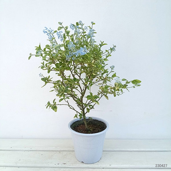 セアノサスはカリフォルニアライラックという名前で人気の低木です。小さな花が集まって、5cmくらいの花穂を形成し、ライラックのような可憐な姿です。エルドラドは淡青紫色の花で珍しい斑入り葉で、斑の入り方も変化があり、非常に美しいです。鉢植えで育てることもできます。多湿にすると枯れることがありますので、水遣りは控えめに。特に夏季は多湿にならないよう注意してください。★秋〜冬は剪定済みの苗となります。5月以降は開花終了株となる場合があります★