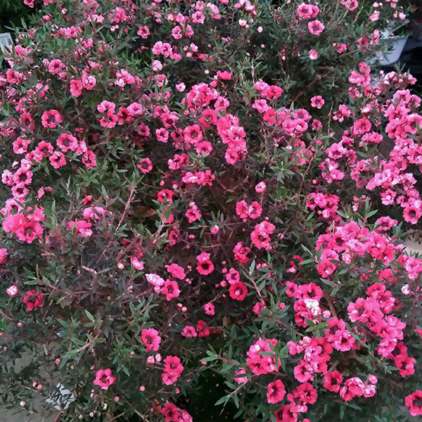 早春の花、ギョリュウバイ。ニュージーランド原産のティーツリーの仲間です。小さな葉を茂らせる常緑低木で、梅の花に似た花を冬から春にかけて開花させます。開花期間が長く丈夫で育てやすい花木なので、春先の鉢花として人気です。庭に植え替えると年々大きくなり、最大樹高は3〜4mになります。耐寒性はマイナス7度まで。この品種は濃桃色八重の花です。