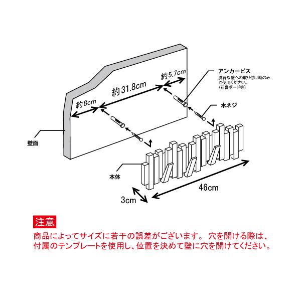 木の棒をいくつも横に並べたような壁掛けタイプのフックです。