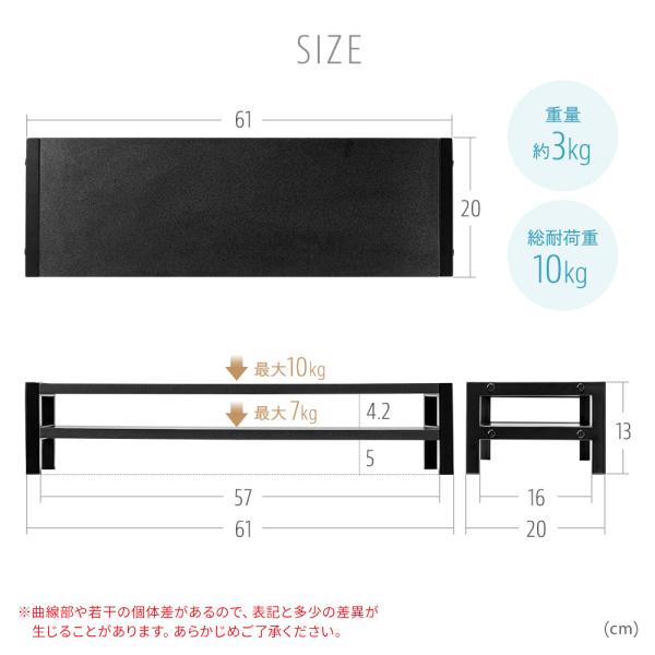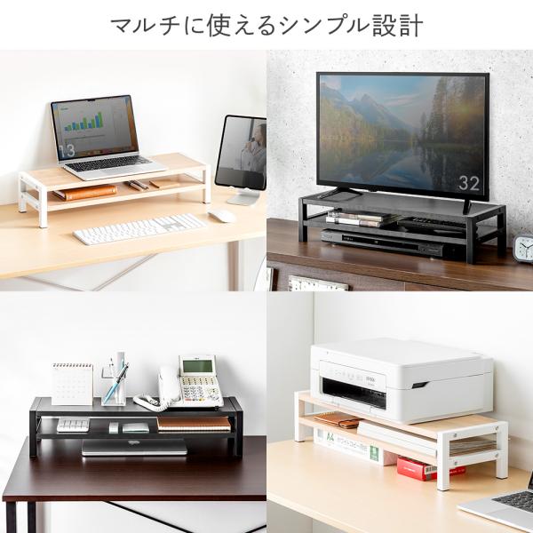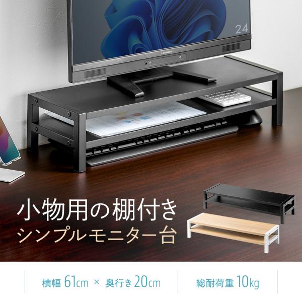 スマホなどの小物も置ける棚付きモニター台。さまざまな状況で使えるシンプルデザインで、耐荷重10kg。