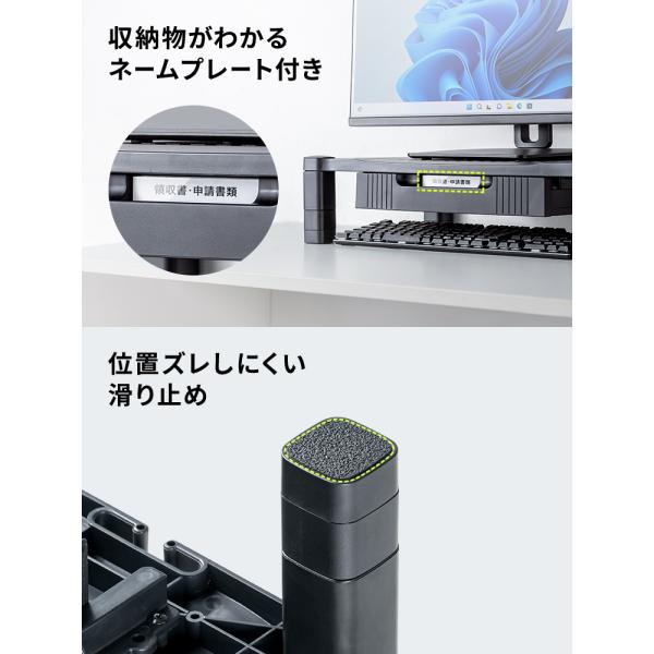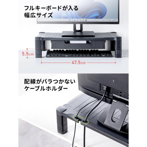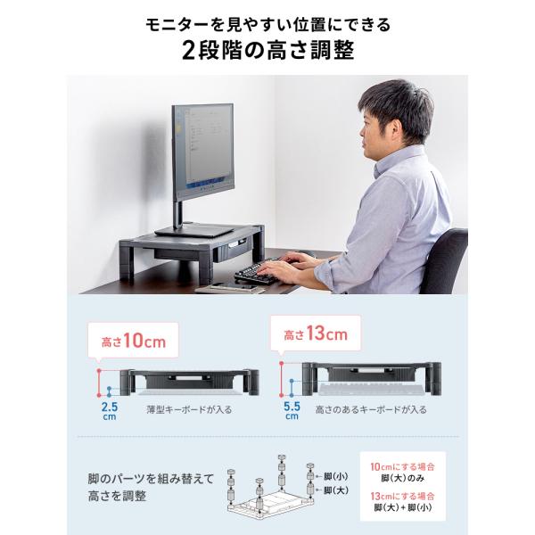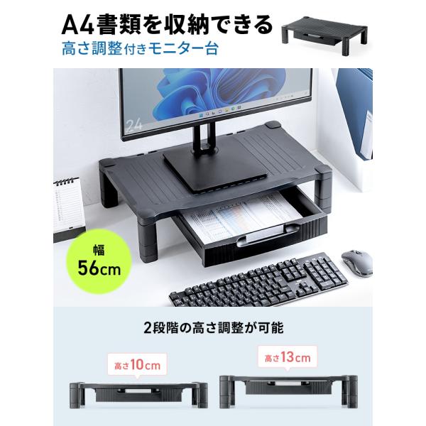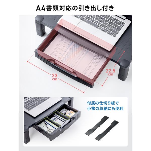 A4用紙が入る引き出し付きの、2段階高さ調整できるモニター台。ワイドタイプ。