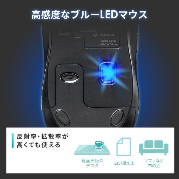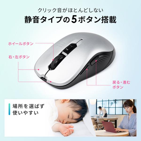 クリック音のほとんどしない静音タイプのワイヤレスマウスです。高感度ブルーLED採用。5ボタン仕様。