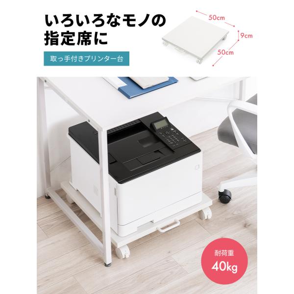 スライダー式プリンタ台です。小型レーザープリンタやインクジェット複合機をデスク下に収納し、机が広く使えるプリンタスタンドです。取手とキャスター付きで移動も楽々。