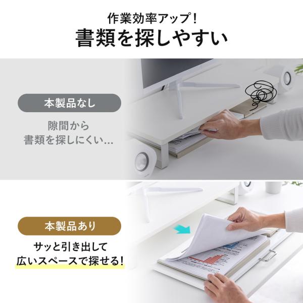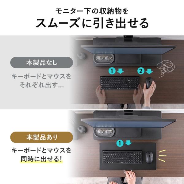 モニター台の下にノートパソコンやキーボード、マウスなどを収納して引き出すのに便利な卓上スライダー。底面には小型ローラーを搭載しスムーズに引き出せます。丈夫なスチール製で耐荷重10kg。組み立て不要。