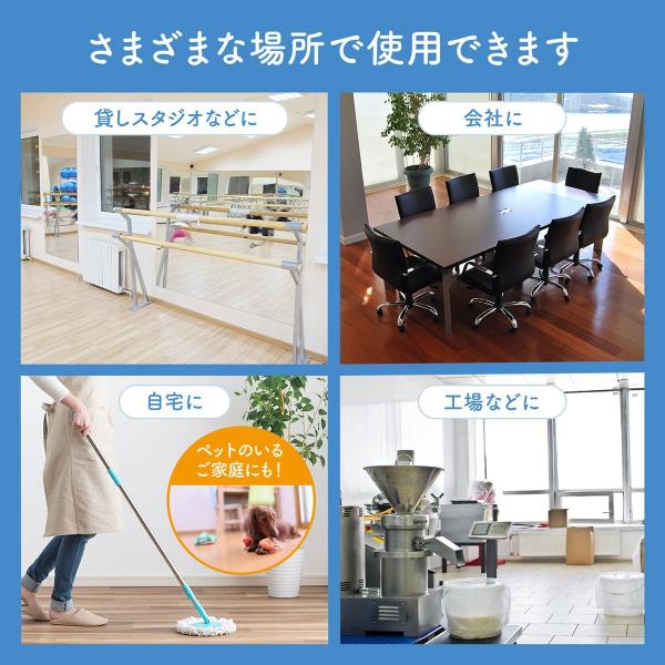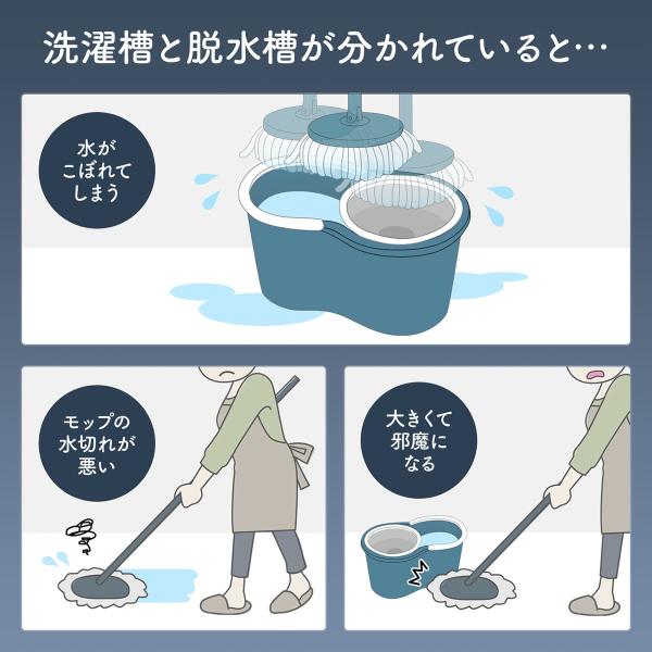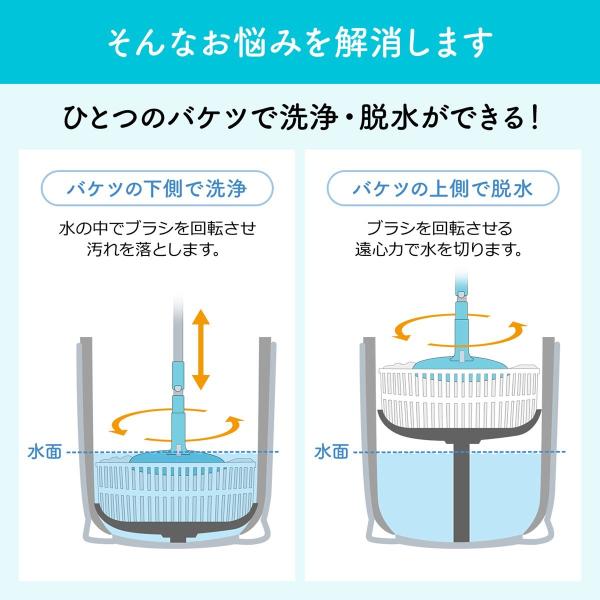 バケツ1つで洗浄と脱水ができる回転モップ。立ったまま楽々水掃除ができ、自宅やオフィス、食堂や工場など様々な場所で使用できる水拭きモップ。柄の長さも伸縮できるので、身近な場所からての届きにくい場所までしっかり掃除ができるクリーニングモップ。