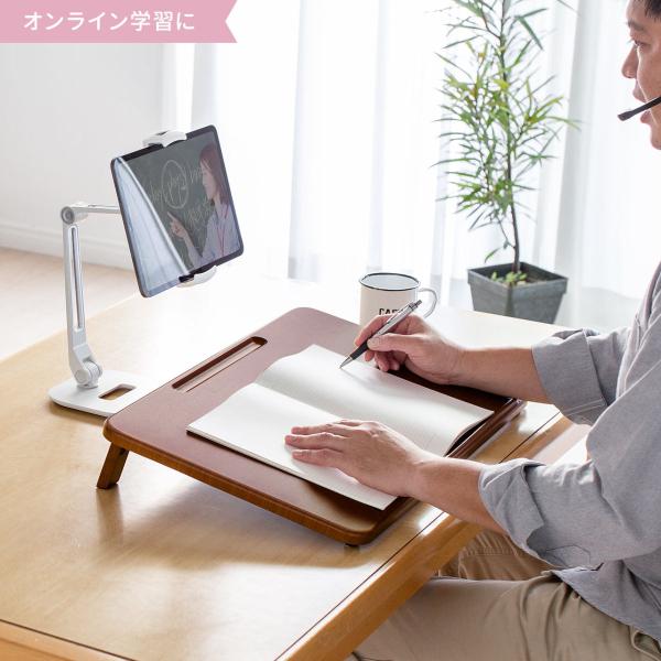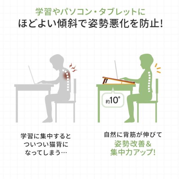 机上に置くことで約10°の程よい傾斜を作り、学習時の姿勢矯正が可能な学習台。子供の学習時のライティングボードとしての学習補助や、テレワークでのノートパソコンスタンドとしても使用可能。タッチペンや筆記用具を置けるペントレー付き。