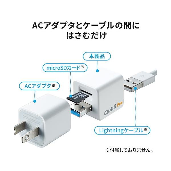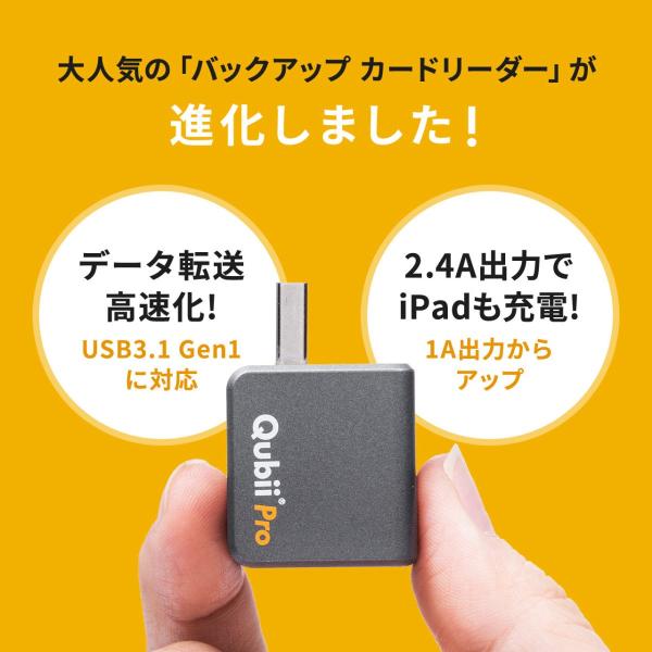 ACアダプタと本体を接続し、専用アプリ「Qubii Pro」を利用してiPhoneやiPadの写真・動画データ、連絡先のデータを自動バックアップすることができるカードリーダー。USB充電器、microSDカードリーダーとしても使用できる。iOSアプリ「ファイルアプリ」との連携に対応し、iPhoneの中にあるファイルをQubii Proアプリに移動できる。USB3.1 Gen1。5V/2.4A出力対応。