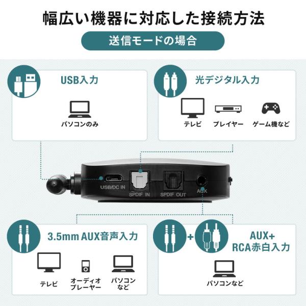 Bluetoothの送信、受信ができるBluetoothトランスミッター&レシーバー。テレビのBluetooth化に最適。Bluetooth機器を2台同時に接続可能・低遅延、ハイレゾ相当のapt-X HDにも対応。途切れにくいClass1対応のBluetooth送信機・受信機。3.5mm・光デジタル・USB接続対応。