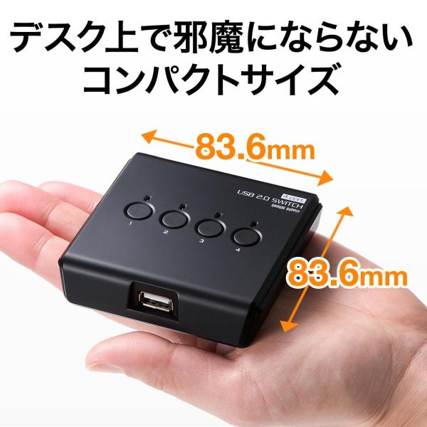パソコン4台をボタン押しの手動での切替が出来るUSB切替器。手のひらサイズのコンパクトで、WindowsとMacの両対応。USBケーブル 1本付き。