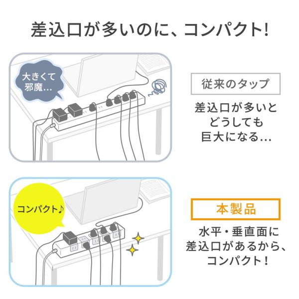 水平・垂直面にプラグを差せるので従来のタップよりコンパクト。