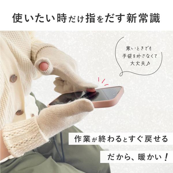 脱ぎ履きの手間を省くため、指先を特殊な編み方にし、よく使う人差し指と親指を着脱式にしました。