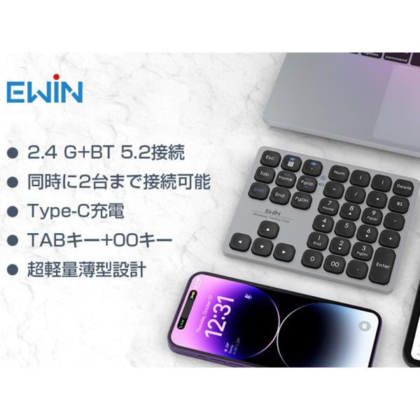 ワイヤレステンキーキーボード Ewin Bluetooth5.2 マルチペアリング 数字キーボード ブルートゥースキーボード 薄型 電卓 36キー【Bluetooth+2.4GHz】