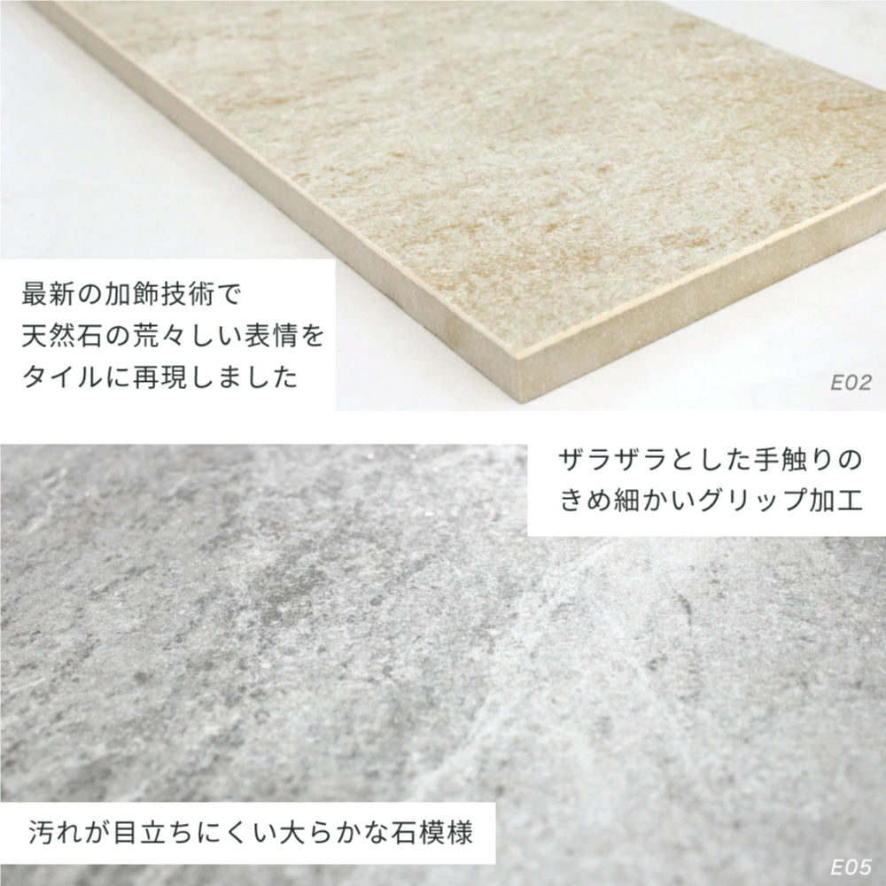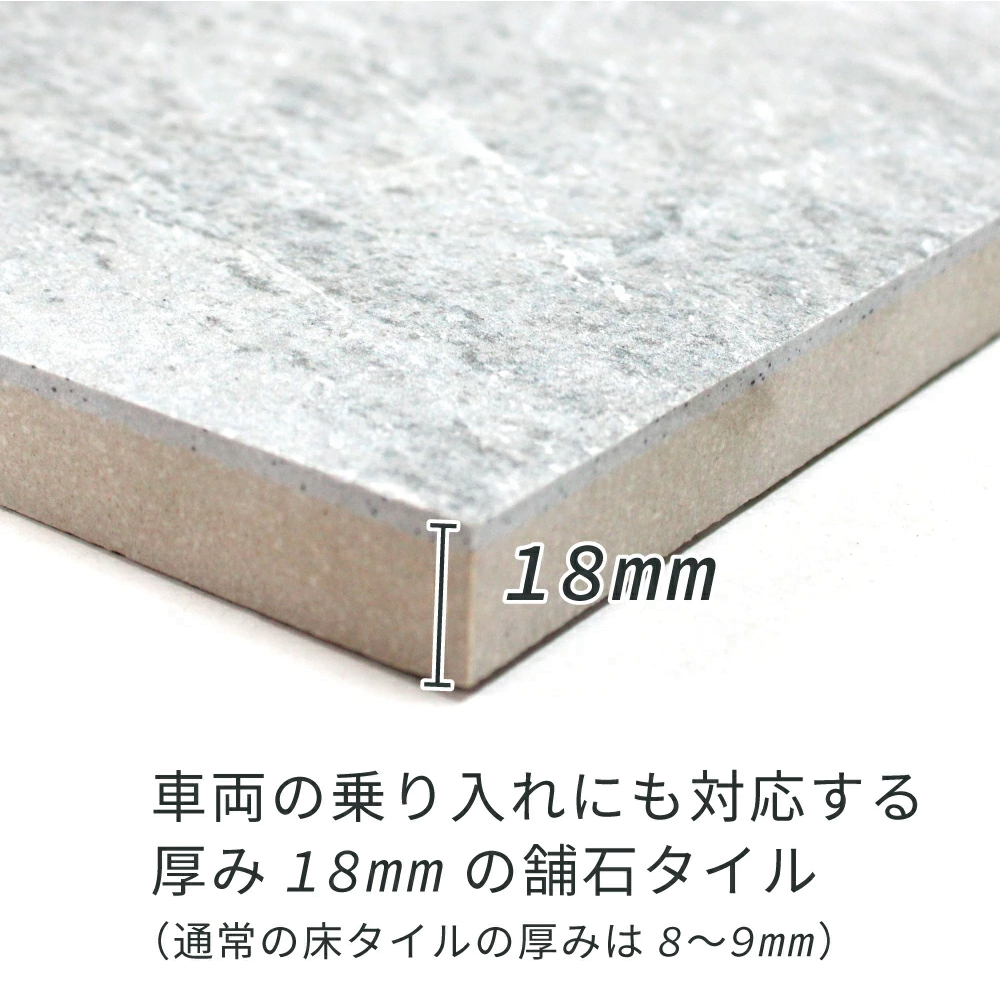 石模様が美しく流れるスレート石の表情を再現した高級感ある厚物タイル。耐久性が高く、歩道・広場・店舗・車の乗り入れまで幅広く使用できる舗石タイル。