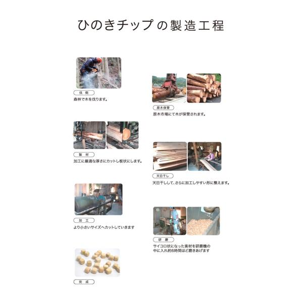 ヒノキチップ:高知県産ヒノキ100%(製造者:室戸木研)