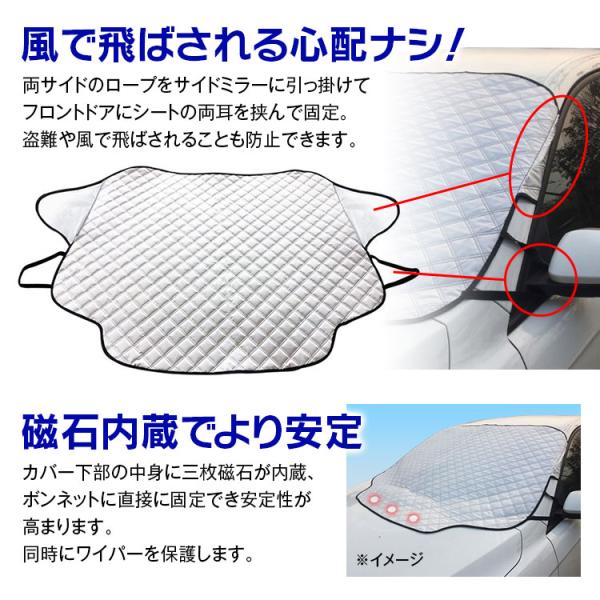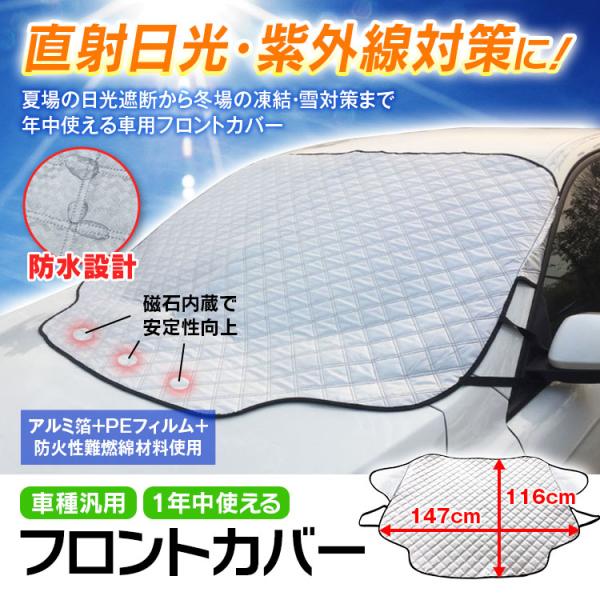 夏場の日光遮断から冬場の凍結・雪対策まで、年中使える車用フロントカバーです。