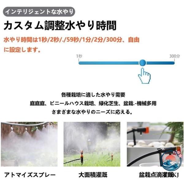 【水やり時間と間隔を設定】水やりの使用時間は0〜300分に設定できます。出水間隔は1〜24時間、1〜15日に設定することができる。