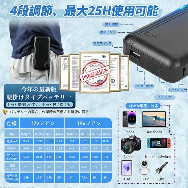 20000mAHの大容量バッテリーを搭載し、最大25時間連続使用が可能です。大容量バッテリーにより、長時間の屋外作業でも安心して使用でき、快適感が長続きします。