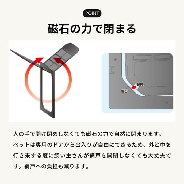 磁石の力で閉まり網戸の開け閉め時に発生する振動や風などで扉のバタつきを抑える構造になっております、網戸本来の機能も損ないません。
