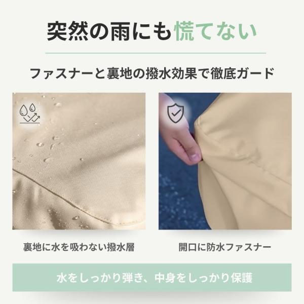 撥水ナイロン生地+防水ファスナー+二重フラップの設計で、短時間の雨にも対応。荷物をしっかりガードします。