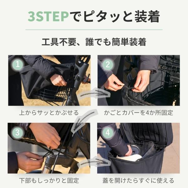 かぶせて絞って結ぶだけの3STEPで完了。誰でもすぐに装着でき、自転車にフィットします。