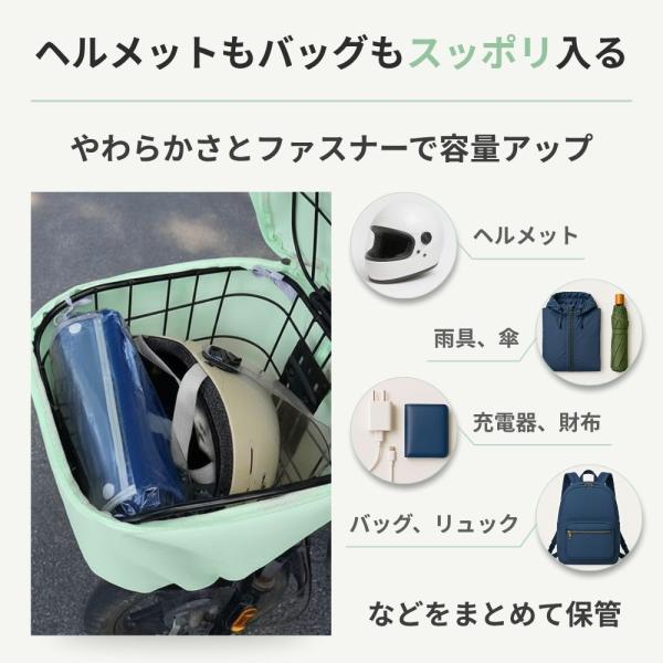 ヘルメットや雨具、バッテリーなどかさばる荷物もすっぽり収納。カバー付きで中身が見えず、防犯・視線対策にも。